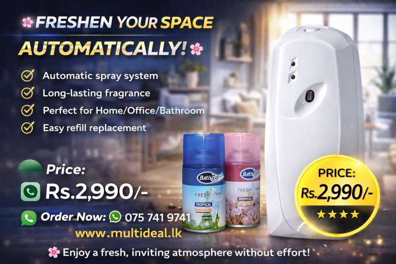 Fresh Matic Automatic Air Freshener is the perfect solution to keep your home, office, bathroom, or shop smelling fresh all day. This automatic spray system releases fragrance at regular intervals, providing long-lasting freshness without manual effort. Easy to install and refill, it is ideal for modern Sri Lankan homes and workplaces. Available now at the best price in Sri Lanka from Multideal.lk with fast ordering via WhatsApp.