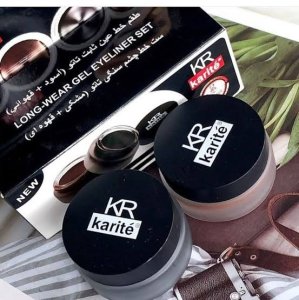 Karite gel eyeliner stays on for hours. It comes in 2 colors, black and brown with 2 brushes. Very pigmented. Can be used as an eye-shadow base. Does smudge, does not crease can easily be removed with any makeup remover.