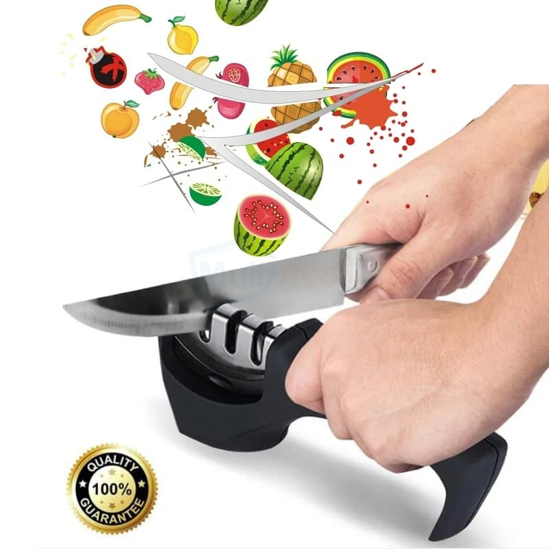 【THE 3 SHARPENING SYSTEM AND USE】: Polish your blades to razor-sharpness with its 3 stage sharpening system, DIAMOND SLOT: Repair and straighten damaged blades. TUNGSTEN SLOT: Provides the major sharpening, and restore the Kitchen Knife V-shape. CERAMIC SLOT: It's a fine tune for a clean polish.