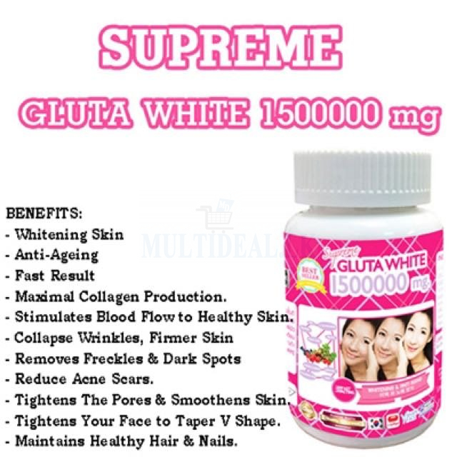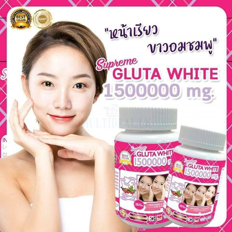 Supreme GLUTA WHITE 1500000 mg. - Small face, slender, no wattle, V shape face - White pink with Supreme White Skin aura - Moisturize, firm, remove wrinkles. Boost up Collagen - Reduce freckles, Remove dark spot & scar scars - Small, smooth pores Tigthen pore - Healthy hair and nails, Healthy Skin, hair & Nail